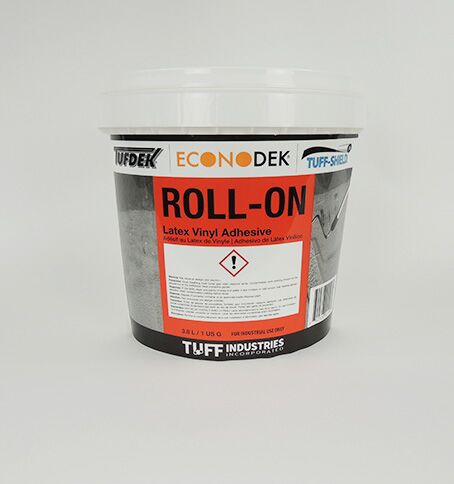 Roll-On adhesive helps to decrease installation and production time, improving efficiency, while eliminating the use of other harmful solvent based adhesives. Tuff membranes must be placed into fresh uncured adhesive allowing for complete adhesive transfer to the back of the vinyl for proper bonding.